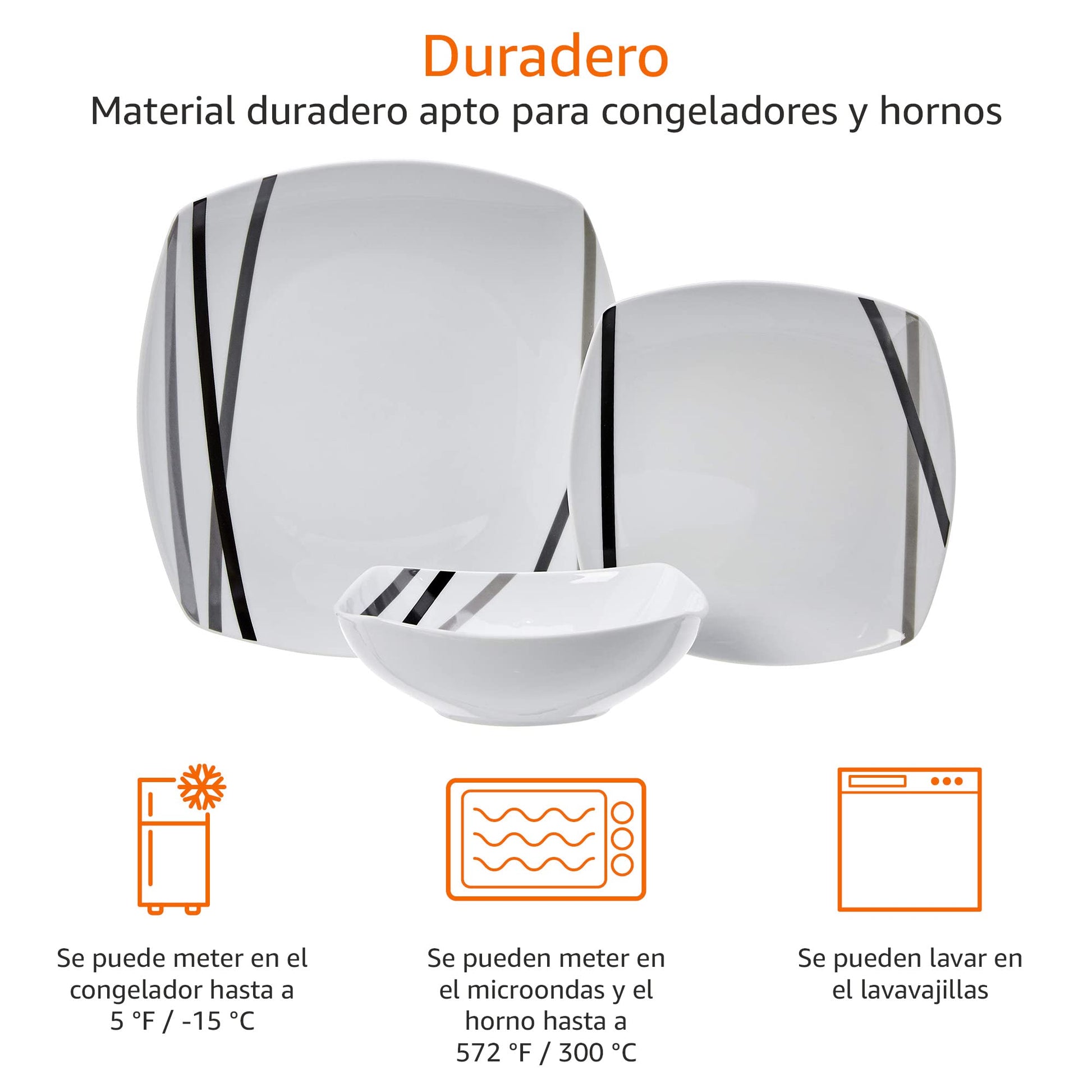 - Apta para lavavajillas, congelador y microondas. Los platos soportan temperaturas de hasta 300 ºC