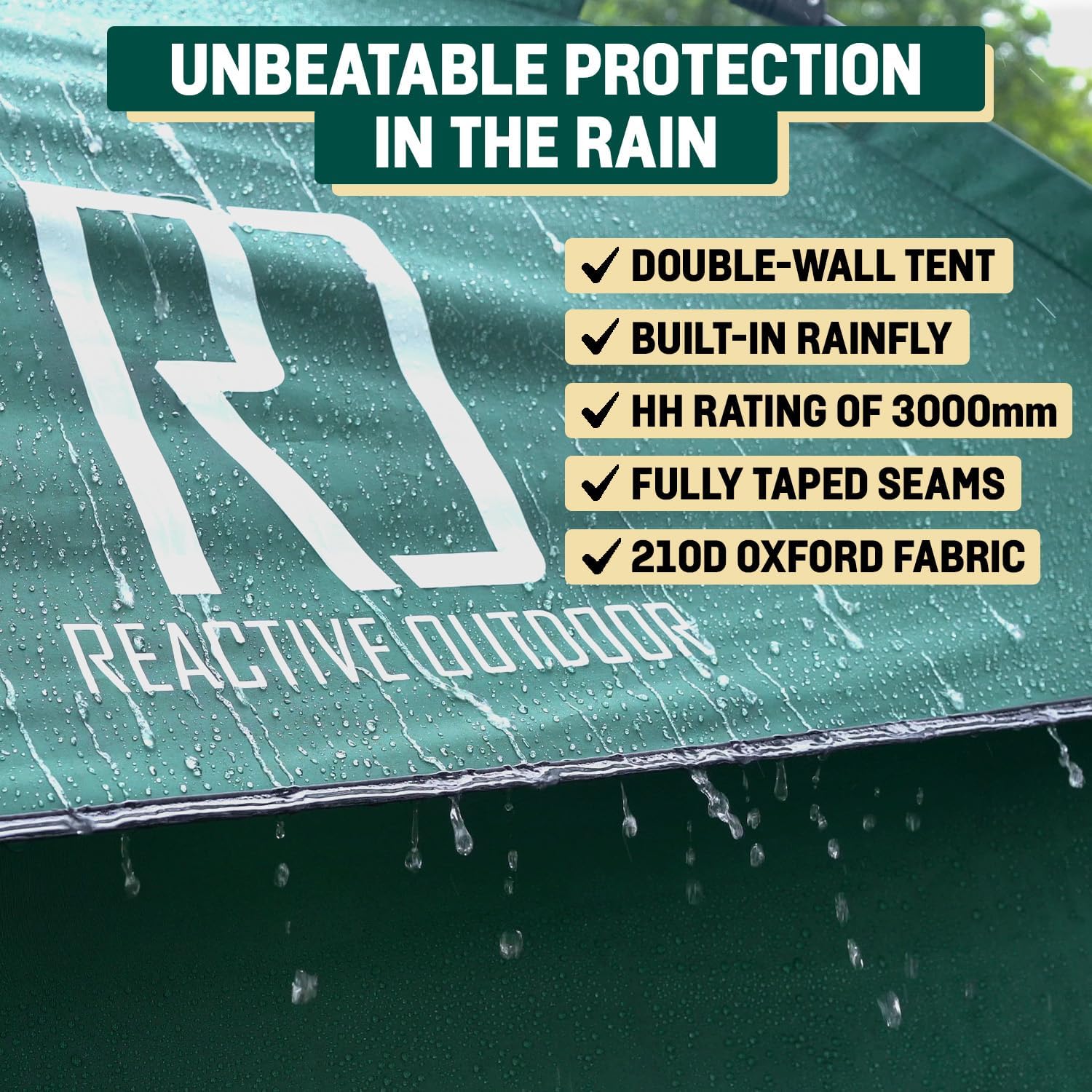 - Resistente al agua con clasificación HH de 3000 mm. La tienda de campaña de 3 segundos está totalmente sellada y protegida con costuras selladas. Esto evita que el agua entre en la tienda de campaña, manteniéndote seco durante la noche durante las fuertes lluvias.