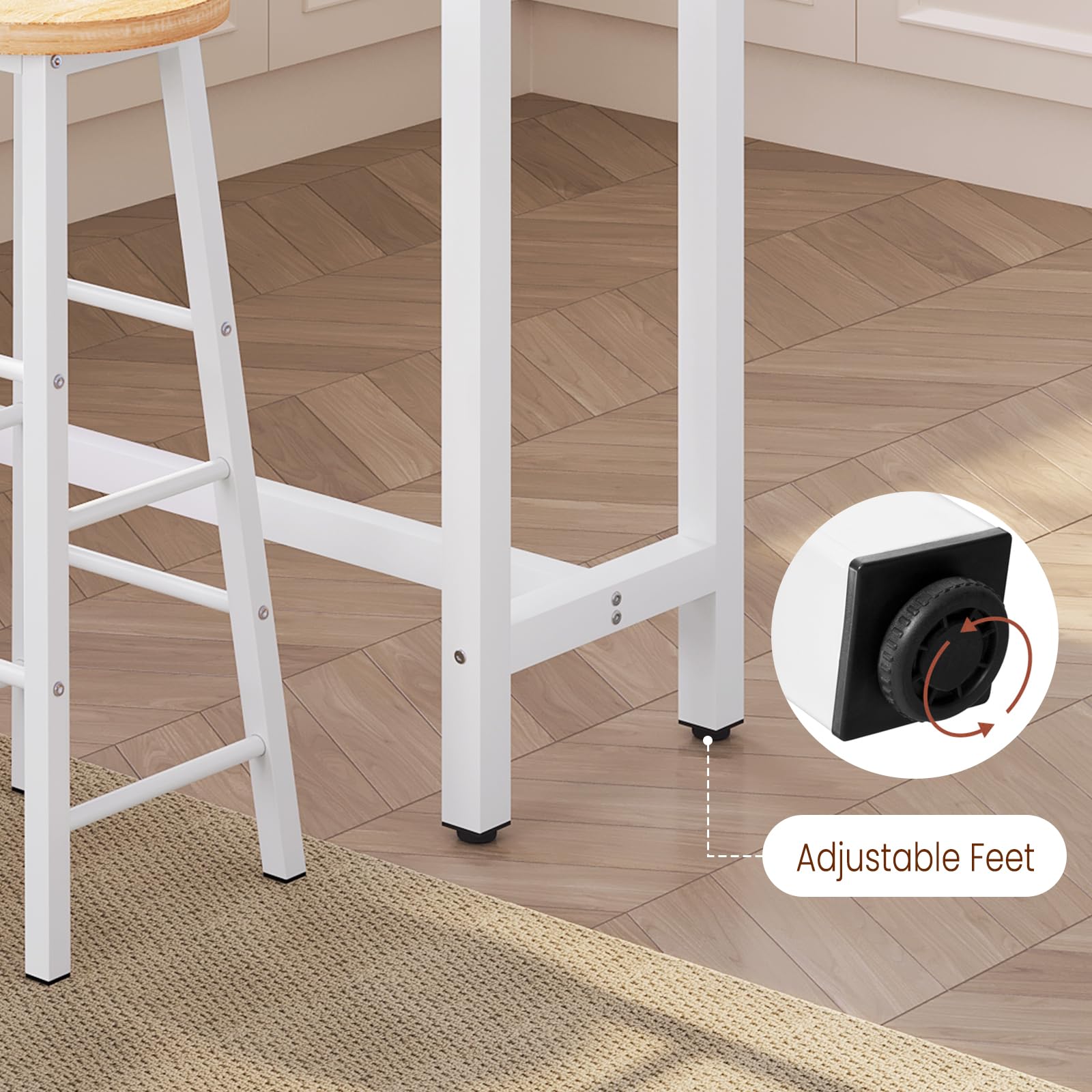 - DETALLES CONSIDERADOS: Las patas ajustables mantienen la mesa estable sobre baldosas o alfombras irregulares, al tiempo que protegen el suelo de arañazos. El travesaño inferior sirve de reposapiés cómodo para que puedan relajarse mientras charlan mientras toman una copa
